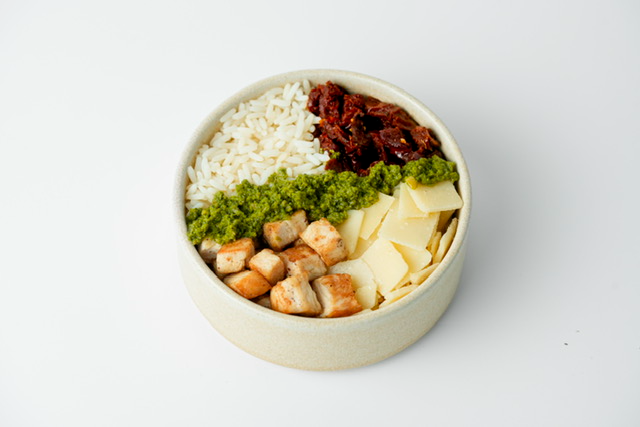 Ingredients: Chicken in rich pesto sauce, white rice, sun-dried tomatoes, and shaved hard cheese.