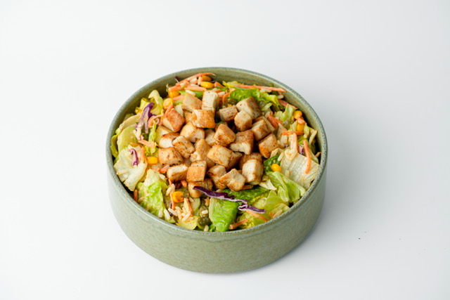 Ingredients: Marinated chicken, mixed fresh greens, marinated carrots, mini cucumbers, white rice, pumpkin seeds, roasted corn, and a light spring dressing.